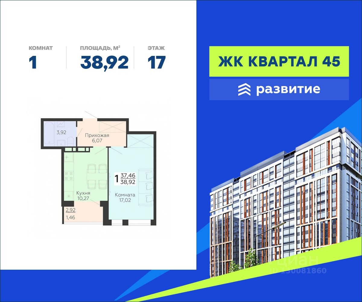 В продаже квартира площадью 38.92 кв. м с черновой отделкой отделкой. Квартира расположена на 17 этаже 18 этажного дома, в жилом комплексе комфорт-класса "Квартал 45".