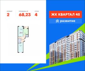 В продаже квартира площадью 68.23 кв. м с черновой отделкой отделкой. Квартира расположена на 4 этаже 18 этажного дома, в жилом комплексе комфорт-класса "Квартал 45".