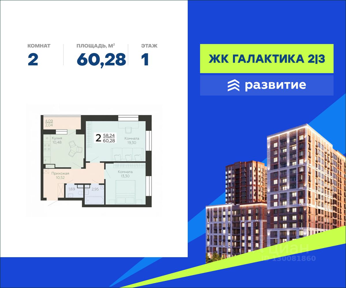 В продаже квартира площадью 60.28 кв. м с отделкой white box. Квартира расположена на 1 этаже 18 этажного дома, в жилом комплексе комфорт-класса "Галактика 2|3".