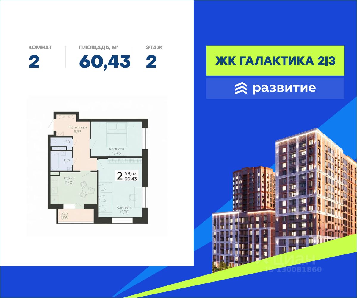 В продаже квартира площадью 60.43 кв. м с отделкой white box. Квартира расположена на 2 этаже 18 этажного дома, в жилом комплексе комфорт-класса "Галактика 2|3".