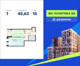 В продаже квартира площадью 45.63 кв. м с черновой отделкой. Квартира расположена на 15 этаже 21 этажного дома, в жилом комплексе комфорт-класса "Галактика 2|3".