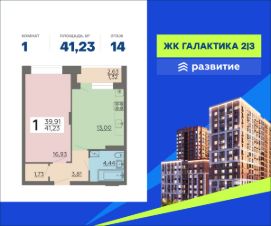 В продаже квартира площадью 41.23 кв. м с черновой отделкой. Квартира расположена на 14 этаже 22 этажного дома, в жилом комплексе комфорт-класса "Галактика 2|3".