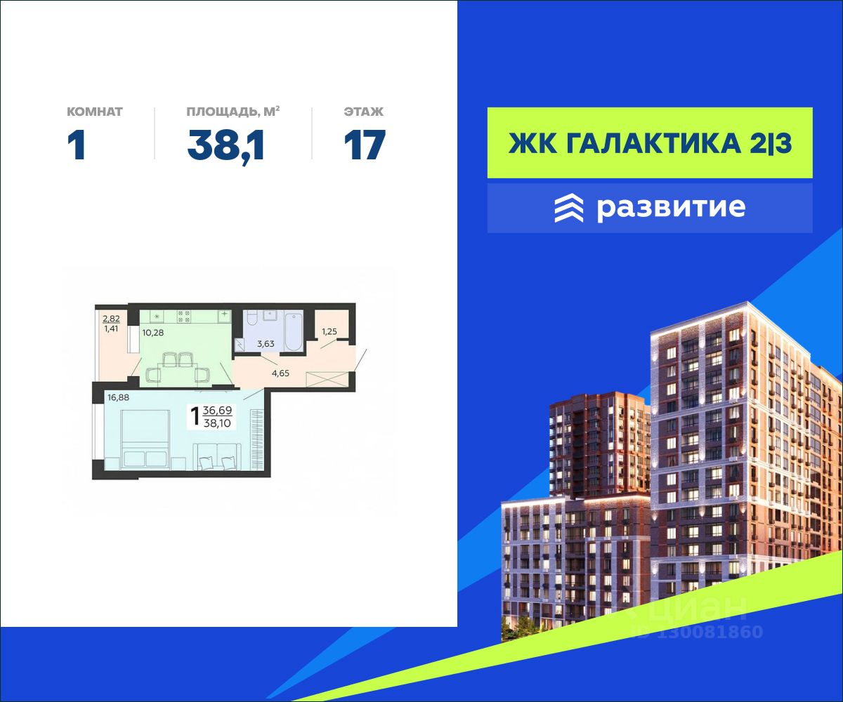 В продаже квартира площадью 38.10 кв. м с черновой отделкой. Квартира расположена на 17 этаже 18 этажного дома, в жилом комплексе комфорт-класса "Галактика 2|3".