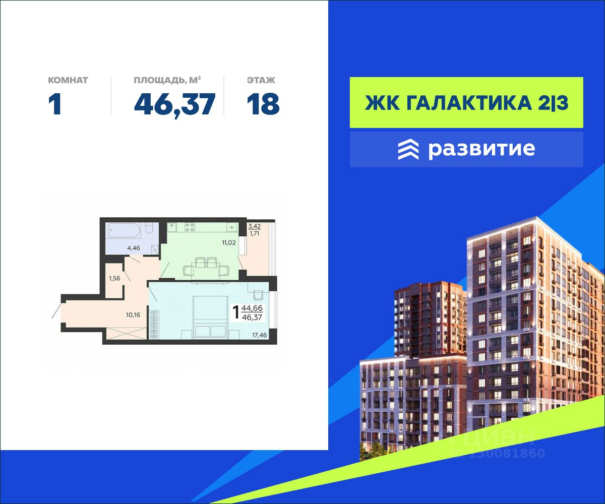 В продаже квартира площадью 46.37 кв. м с черновой отделкой. Квартира расположена на 18 этаже 18 этажного дома, в жилом комплексе комфорт-класса "Галактика 2|3".