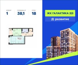 В продаже квартира площадью 38.10 кв. м с черновой отделкой. Квартира расположена на 18 этаже 18 этажного дома, в жилом комплексе комфорт-класса "Галактика 2|3".