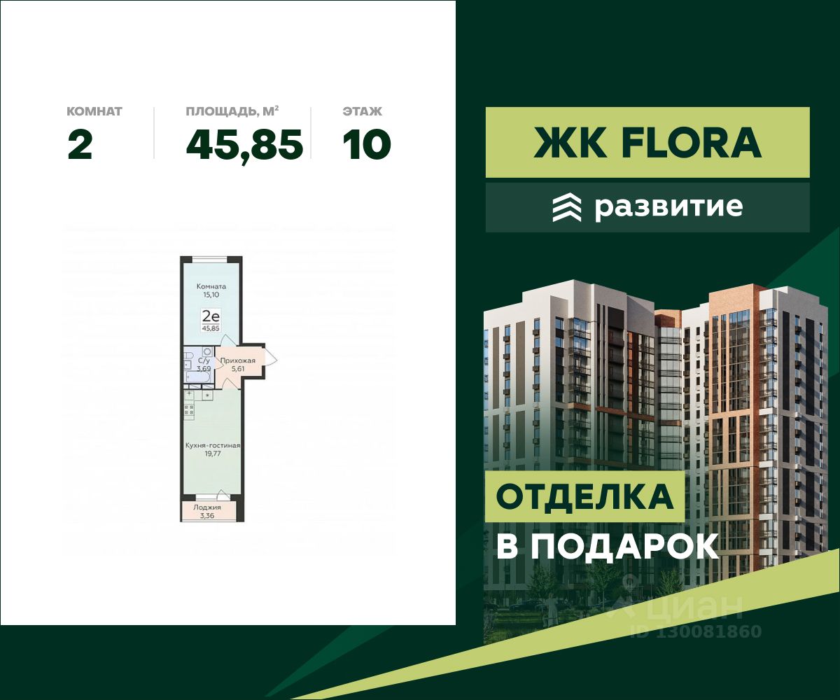 В продаже квартира площадью 45.85 кв. м с отделкой. Квартира расположена на 10 этаже 16 этажного дома, в жилом комплексе комфорт-класса FLORA ("Флора").