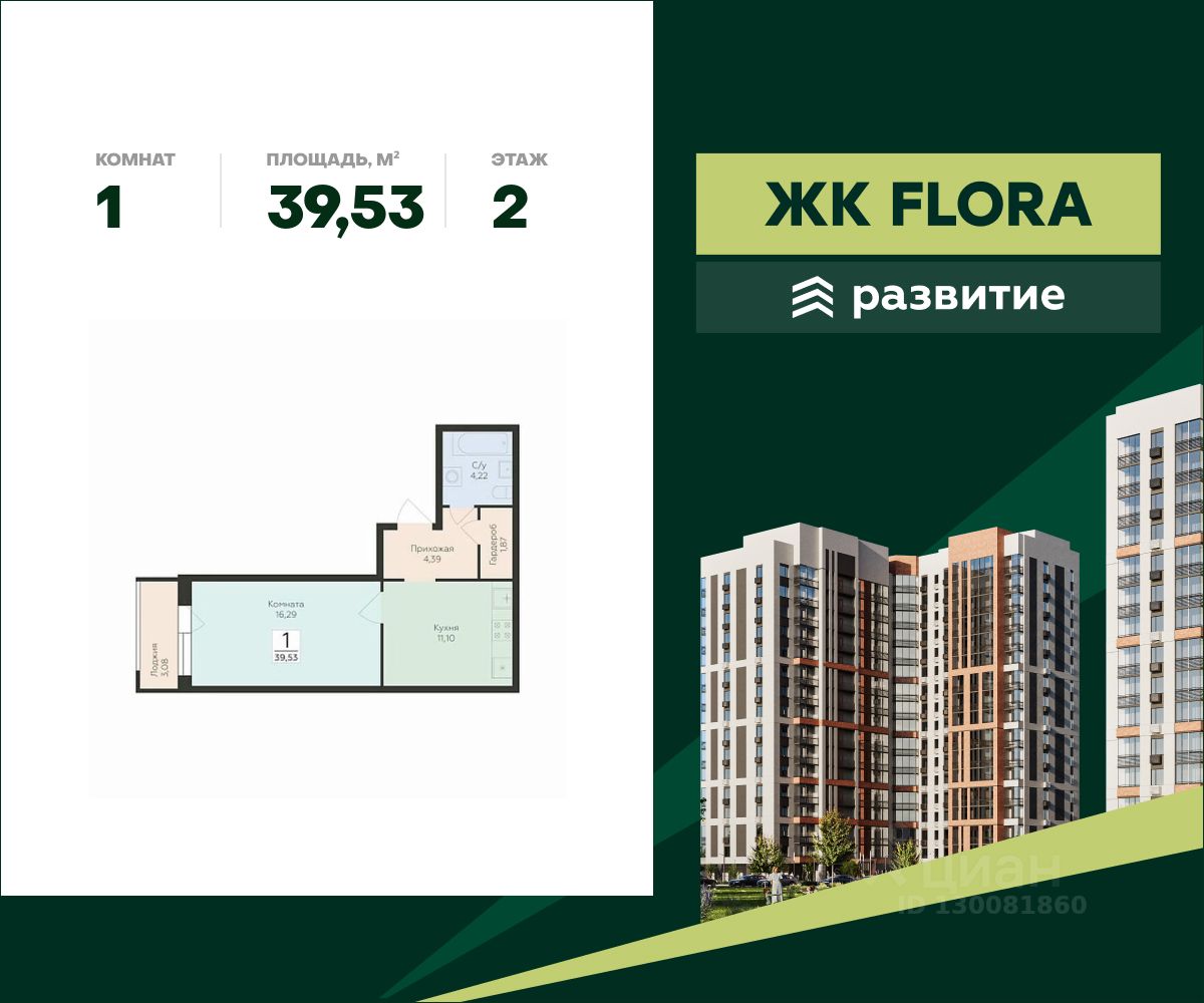 В продаже квартира площадью 39.53 кв. м с отделкой. Квартира расположена на 2 этаже 17 этажного дома, в жилом комплексе комфорт-класса FLORA ("Флора").