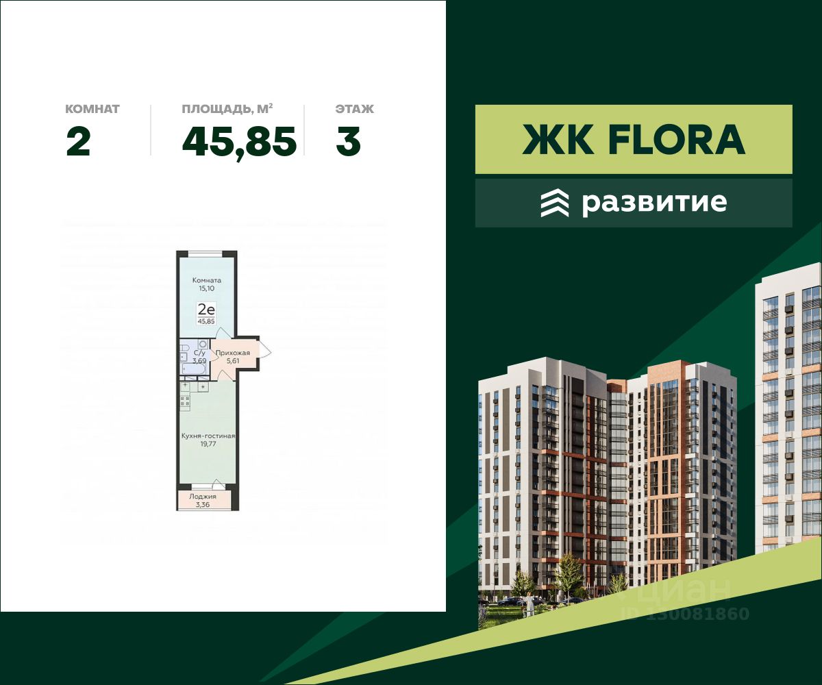 ЖК FLORA - лучшие условия для жизни в одном из самых привлекательных и зелёных районов города. Проект от федерального застройщика ГК "Развитие" состоит из семи секций переменной этажности и также включает в себя мультифункциональные площадки для всех видов отдыха, собственное ритейл-пространство, 270 парковочных мест для автомобилей, множество продуманных планировок. Жизнь в идеальном балансе между природой и современным городом - жизнь в ЖК FLORA!