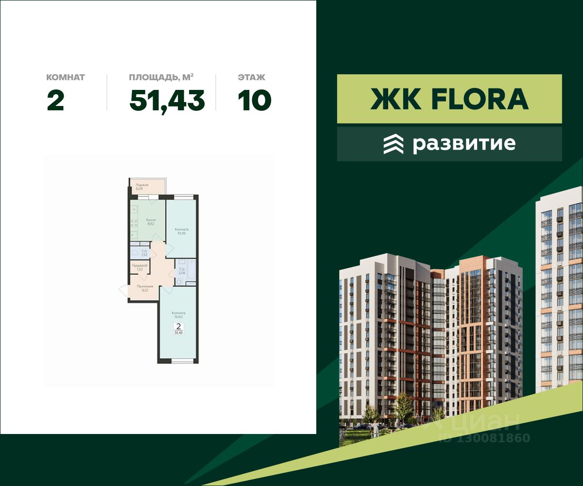 В продаже квартира площадью 51.43 кв. м с отделкой. Квартира расположена на 10 этаже 17 этажного дома, в жилом комплексе комфорт-класса FLORA ("Флора").