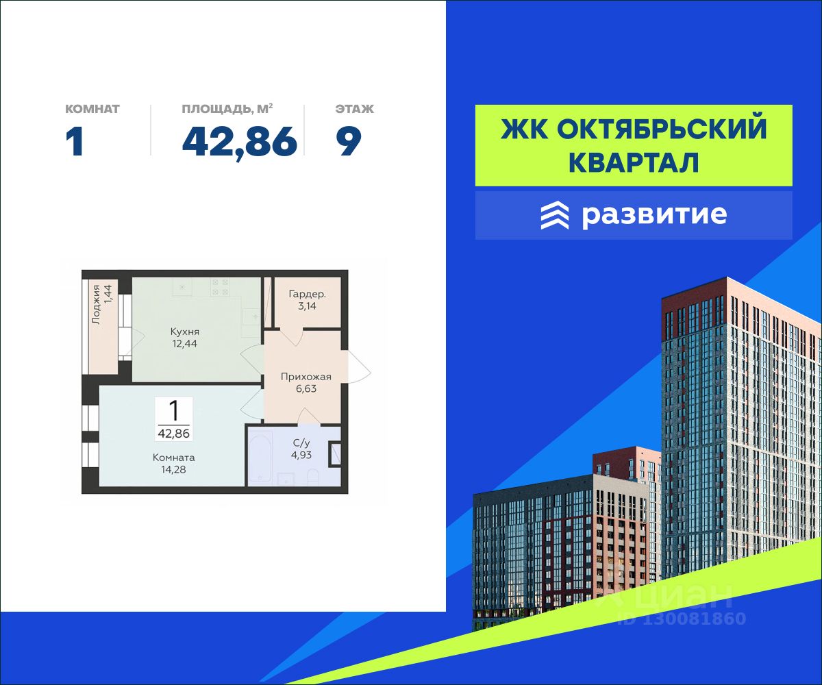 В продаже квартира площадью 42.86 кв. м с черновой отделкой. Квартира расположена на 9 этаже 12 этажного дома, в жилом комплексе "Октябрьский квартал" от девелопера "Развитие".