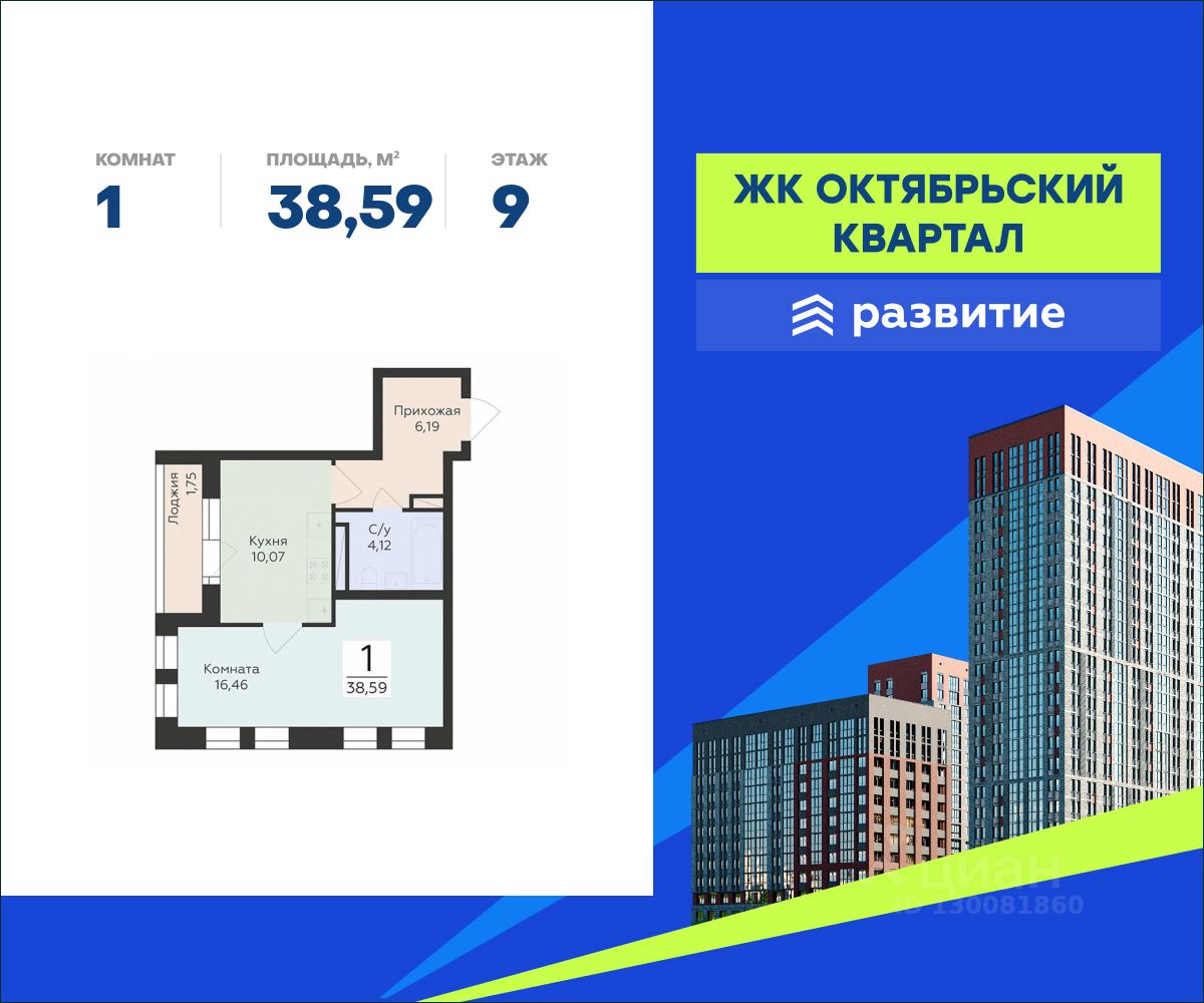 В продаже квартира площадью 38.59 кв. м с черновой отделкой. Квартира расположена на 9 этаже 12 этажного дома, в жилом комплексе "Октябрьский квартал" от девелопера "Развитие".