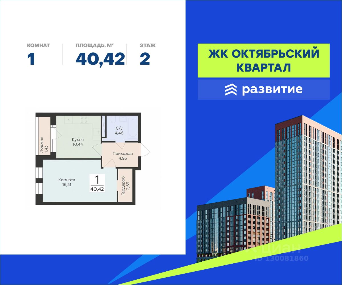 В продаже квартира площадью 40.42 кв. м с черновой отделкой. Квартира расположена на 2 этаже 12 этажного дома, в жилом комплексе "Октябрьский квартал" от федерального застройщика "Развитие".