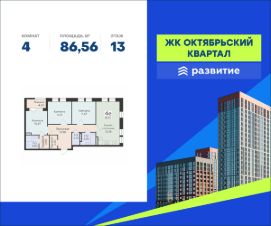 В продаже квартира площадью 86.56 кв. м с черновой отделкой. Квартира расположена на 13 этаже 24 этажного дома, в жилом комплексе "Октябрьский квартал" от девелопера "Развитие".