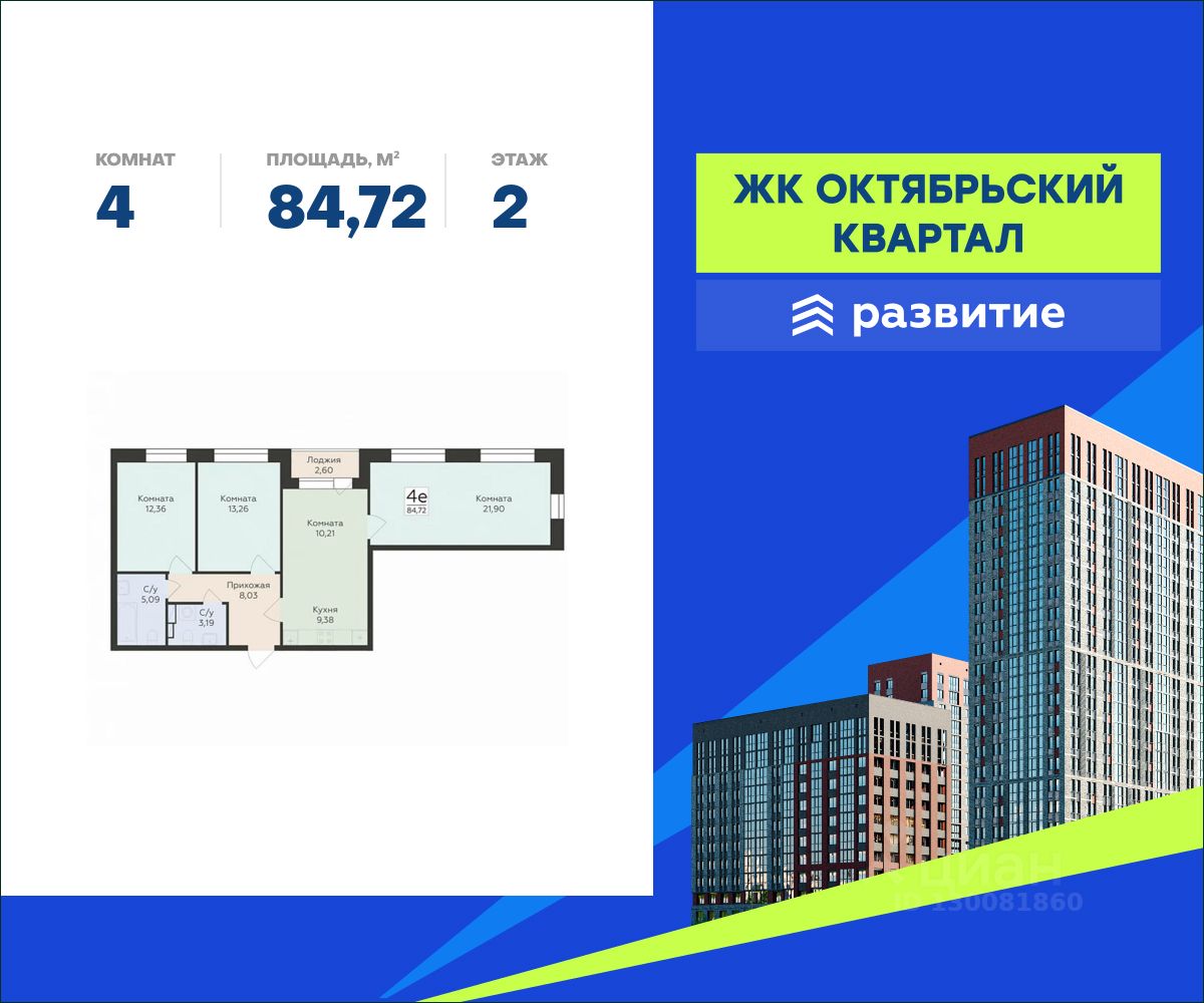 В продаже квартира площадью 84.72 кв. м с черновой отделкой. Квартира расположена на 2 этаже 12 этажного дома, в жилом комплексе "Октябрьский квартал" от девелопера "Развитие".