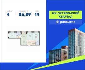 В продаже квартира площадью 86.89 кв. м с черновой отделкой. Квартира расположена на 14 этаже 24 этажного дома, в жилом комплексе "Октябрьский квартал" от девелопера "Развитие".
