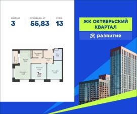В продаже квартира площадью 55.83 кв. м с черновой отделкой. Квартира расположена на 13 этаже 24 этажного дома, в жилом комплексе "Октябрьский квартал" от девелопера "Развитие".