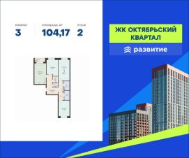 В продаже квартира площадью 104.17 кв. м с черновой отделкой. Квартира расположена на 2 этаже 24 этажного дома, в жилом комплексе "Октябрьский квартал" от федерального застройщика "Развитие".
