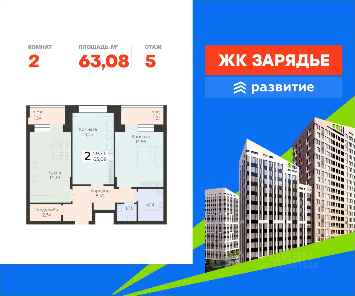 В продаже квартира площадью 63.08 кв. м с черновой отделкой. Квартира расположена на 5 этаже 25 этажного дома, в новом микрорайоне комфорт-класса "Зарядье" (Девелопер - федеральный застройщик ГК "Развитие").