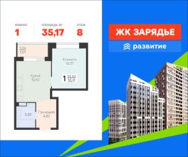 В продаже квартира площадью 35.17 кв. м с черновой отделкой. Квартира расположена на 8 этаже 15 этажного дома, в новом микрорайоне комфорт-класса "Зарядье" (Девелопер - ГК "Развитие").