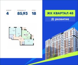 В продаже квартира площадью 85.93 кв. м с черновой отделкой отделкой. Квартира расположена на 18 этаже 18 этажного дома, в жилом комплексе комфорт-класса "Квартал 45".