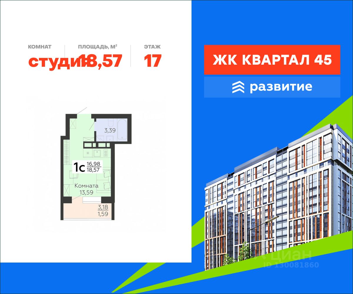 В продаже квартира площадью 18.57 кв. м с черновой отделкой отделкой. Квартира расположена на 17 этаже 18 этажного дома, в жилом комплексе комфорт-класса "Квартал 45".