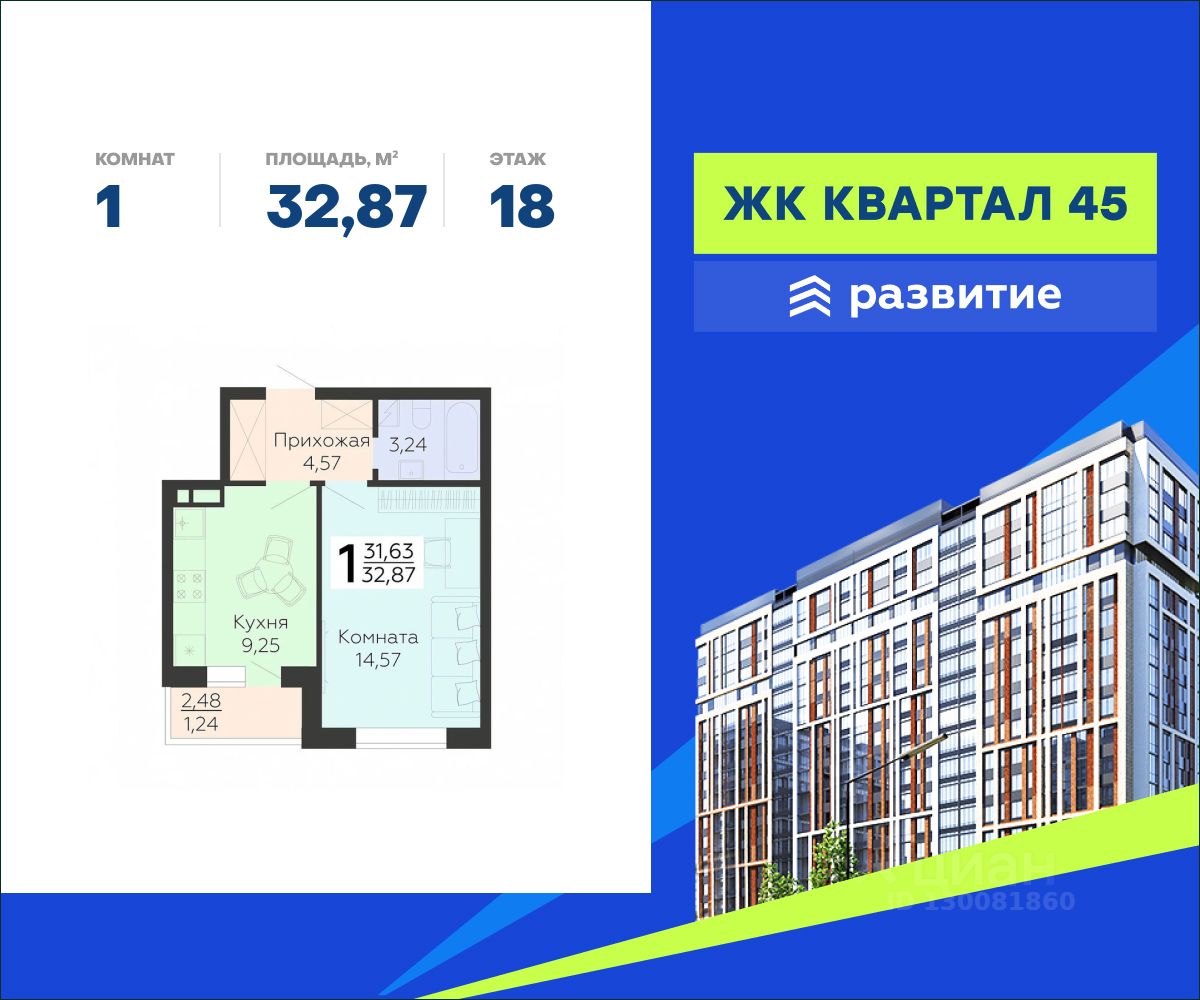 В продаже квартира площадью 32.87 кв. м с черновой отделкой отделкой. Квартира расположена на 18 этаже 18 этажного дома, в жилом комплексе комфорт-класса "Квартал 45".