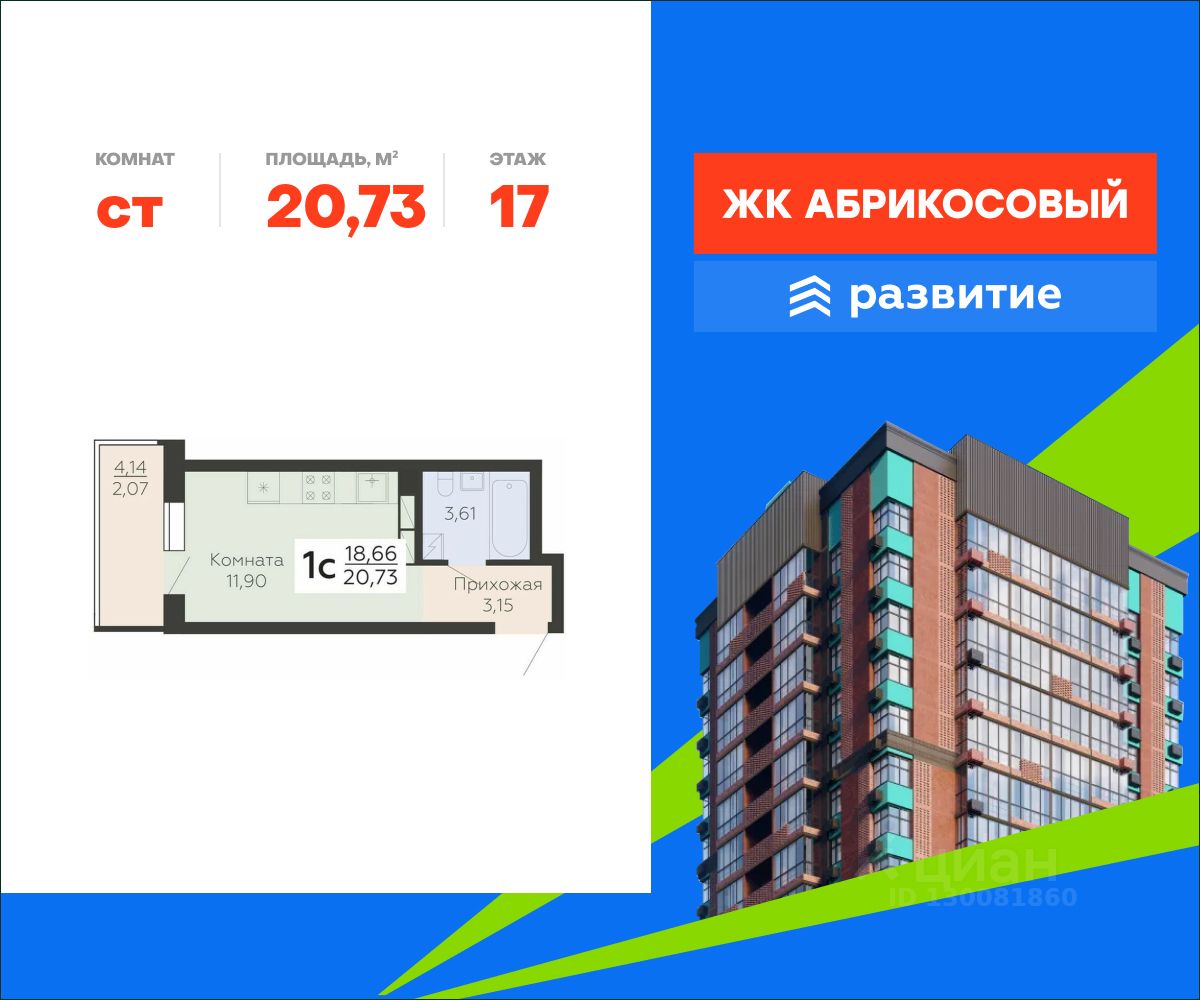 В продаже квартира площадью 20.73 кв. м с черновой отделкой. Квартира расположена на 17 этаже 19 этажного дома, в жилом комплексе комфорт-класса "Абрикосовый" (Застройщик - федеральный застройщик ГК "Развитие").