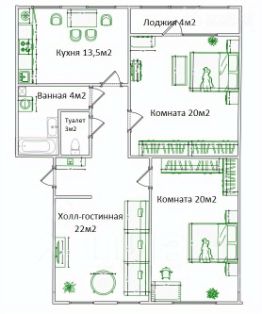 Три комнаты: две спальни по 20,4 м2 и 19,4 м2, и холл - гостинная 22,6 м2.