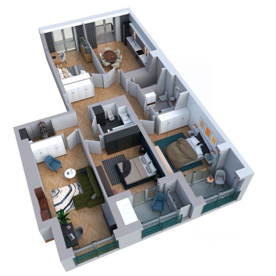 Лаконичная планировка с окнами на две стороны и террасой. Такая квартира всегда наполнена светом и просторна. Зона прихожей обособлена, что позволяет сохранять в квартире чистоту в любой сезон.
