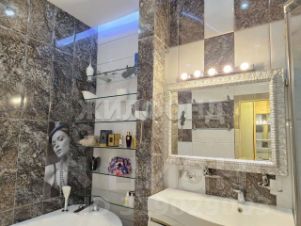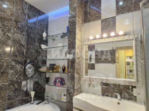 На полу керамогранит Испания, дорогая паркетная доска 3 оттенков, двухуровневые натяжные потолки с разной подсветкой и цветовыми эффектами, трёхзонное освещение. В спальне и детской точечная LЕD подсветка на потолке в виде бесконечности, полный цветовой спектр регулировки. Много освещения и дополнительных розеток.