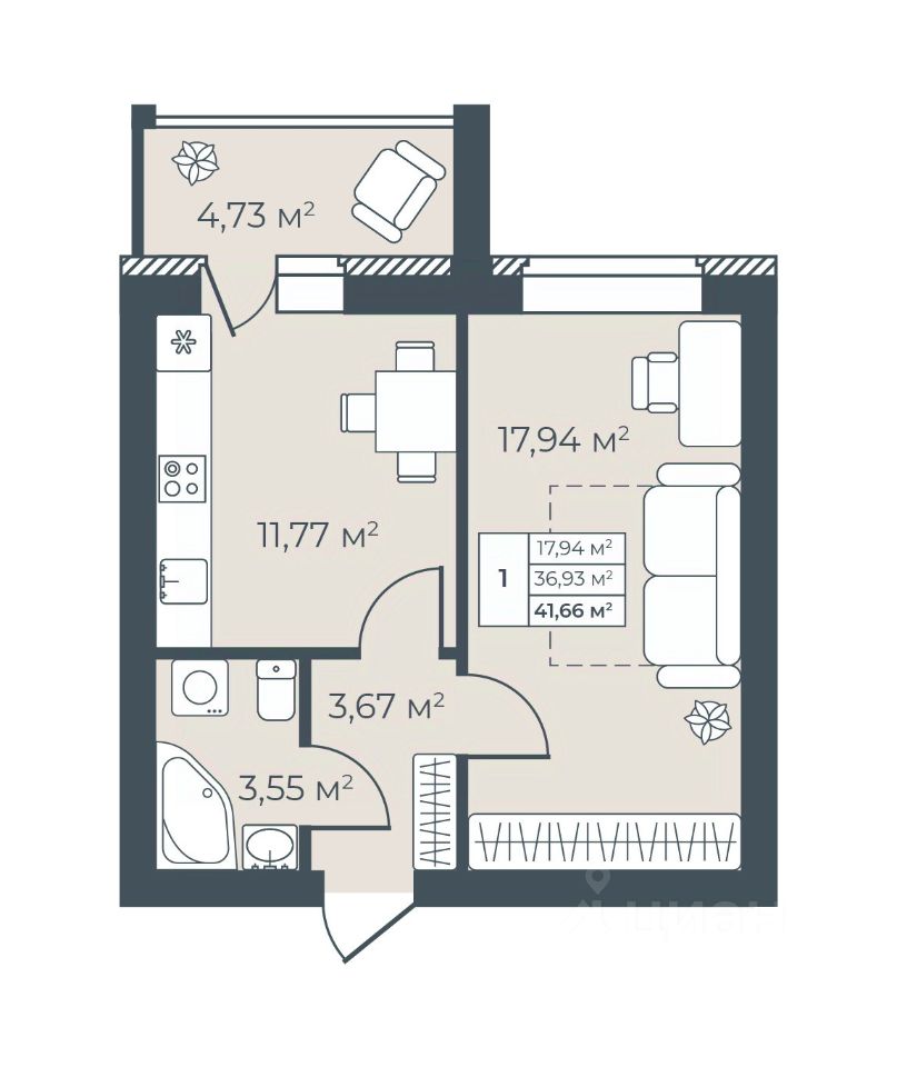 Общая площадь41,66 м²
