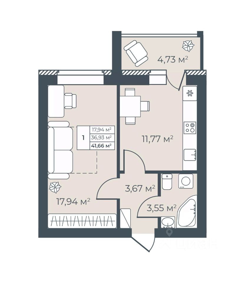 Общая площадь41,66 м²