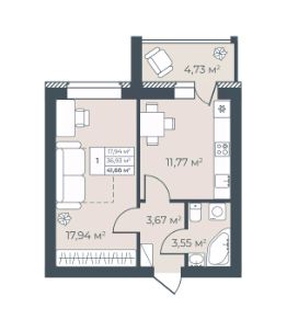 Продается 1-комн. квартира, 41,66 м²
