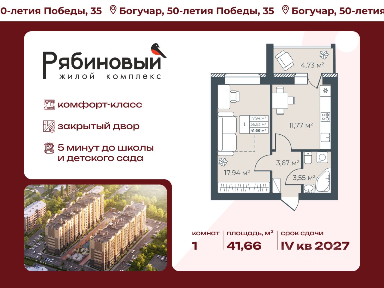 Время выбирать — столичный комфорт прямо в Богучаре! Жилой "Рябиновый" состоит из двух кирпичных домов, один из которых сдается уже осенью 2025 года. Закрытая дворовая территория обеспечивает безопасное пространство для отдыха детей и взрослых, а дети всех возрастов найдут себе занятие по душе на лучшей детской площадке в городе. Дворы и входные группы расположены на одном уровне — нет ступенек, пандусов и лишних препятствий, что позволяет без труда передвигаться маленьким жителям жилого комплекса, их родителям с колясками и пожилым людям. Чистые и светлые подъезды с дизайнерским ремонтом создают приятное впечатление с порога. Для удобства жителей предусмотрены помещения для хранения велосипедов, колясок и спортинвентаря. В каждом подъезде расположены по 2 лифта. Каждая планировка — для жизни. Все площади используются максимально эффективно, в квартирах есть: просторные кухни и гостиные, ниши для шкафов, просторные коридоры, гардеробные и постирочные комнаты. Все квартиры сдаются в улучшенной базовой отделке, которая включает в себя полусухую стяжку, гипсовую штукатурку и разводку электрики. Есть возможность заказать отделку "стандарт" и "премиум", а платеж легко оформить в ипотеку. Оба варианта включают полный набор для комфортного старта: сантехника в санузлах и на кухне, розетки и выключатели, натяжные потолки и межкомнатные двери. В "стандарте" — практичный линолеум и обои, в "премиуме" — стильный ламинат и обои под покраску. Жилой комплекс "Рябиновый" прекрасно подойдет для тех, кто предпочитает сочетание комфорта и технологичности современной квартиры с уютом природы и небольшого города вокруг. Адрес: г. Богучар (Воронежская область) Высота: 9 этажей Квартиры: 186 квартир в первой очереди Материал: кирпич Площадь: 9 779 кв.м жилья в первой очереди