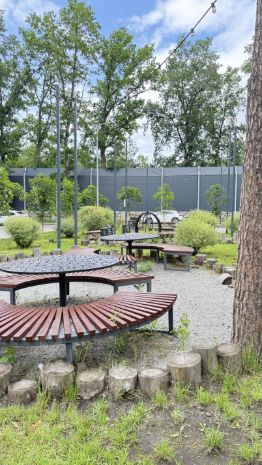 На территории выполнен ландшафтный дизайн, с применением красивого озеленения и прогулочных дорожек. Предусмотрены детские игровые площадки, спортивные, зона барбекю, бассейн.