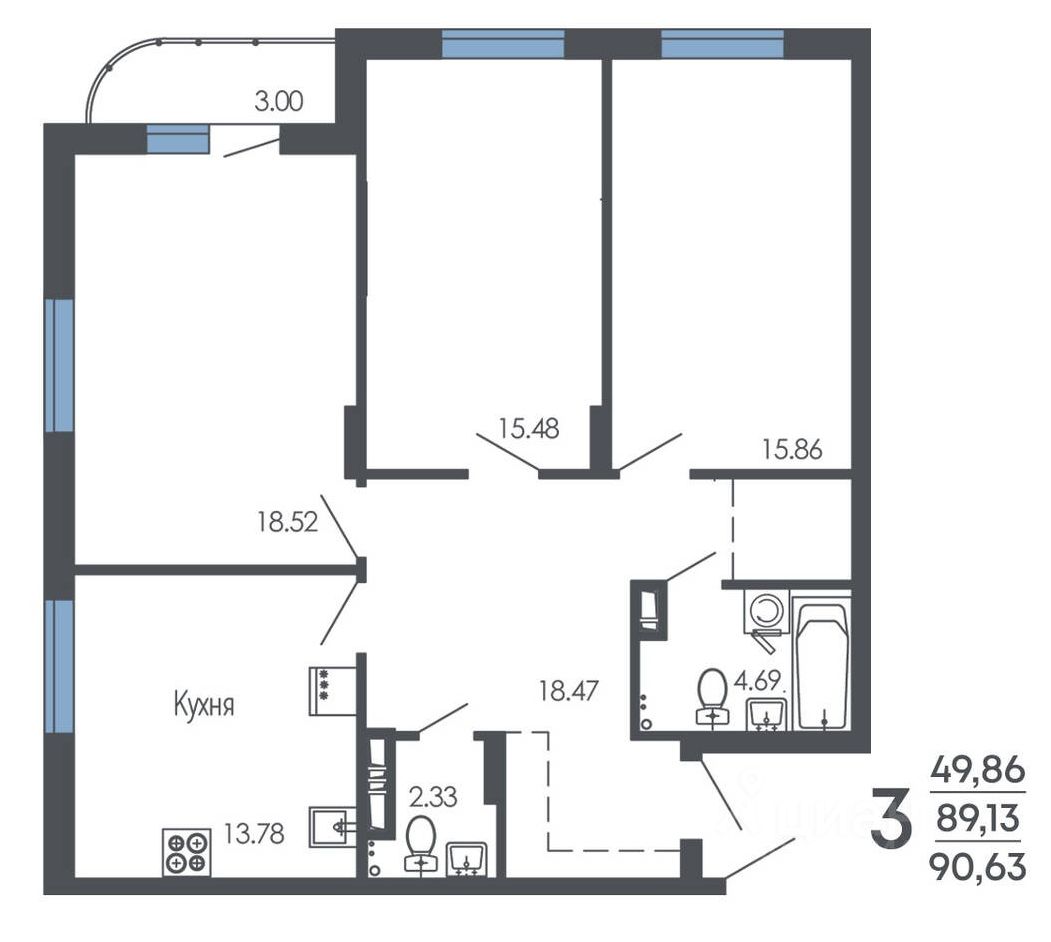 Продаётся 3-комнатная квартира в строящемся доме (Дом 1, дом 2), срок сдачи: I-кв. 2027, общей площадью 90.63 кв.м., на 3 этаже. Новый жилой комплекс от группы компаний "Проект Инвест" расположен по адресу: г. Воронеж, по ул. Шишкова.