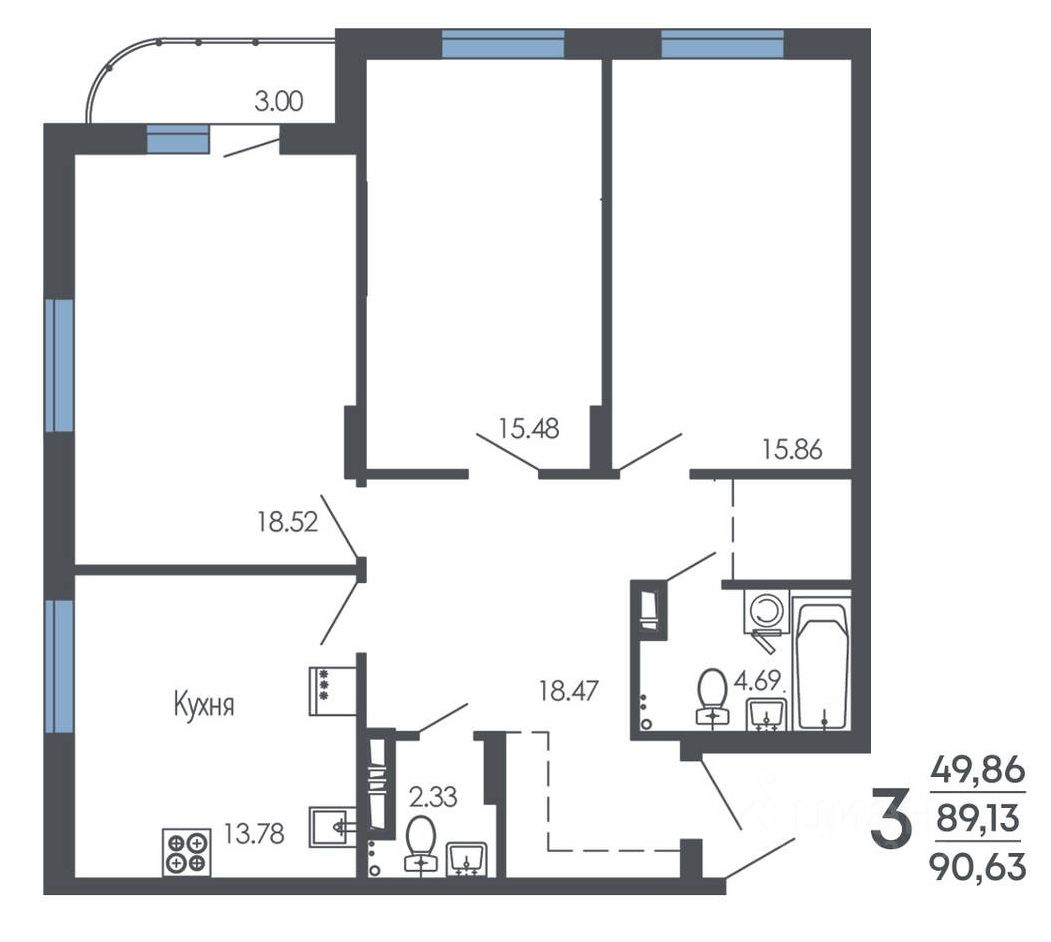 Продаётся 3-комнатная квартира в строящемся доме (Дом 1, дом 2), срок сдачи: I-кв. 2027, общей площадью 90.63 кв.м., на 4 этаже. Новый жилой комплекс от группы компаний "Проект Инвест" расположен по адресу: г. Воронеж, по ул. Шишкова.