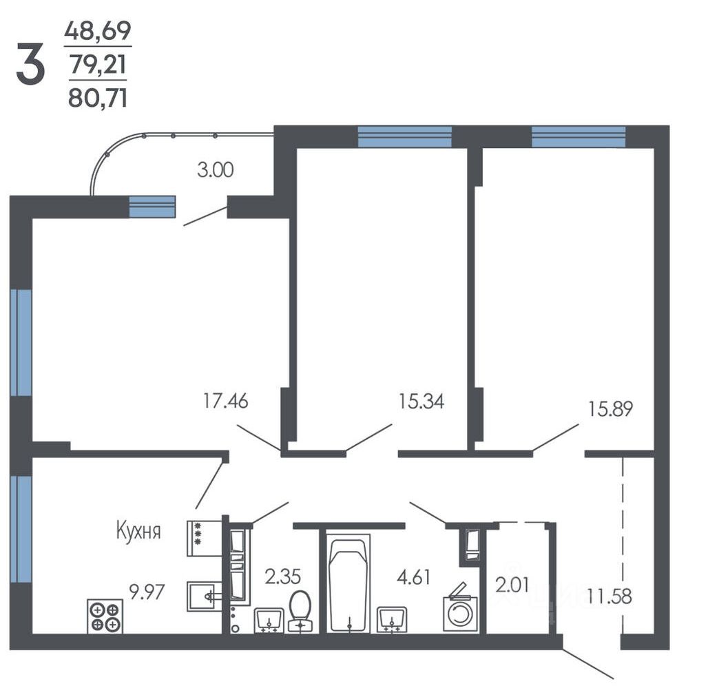 Продаётся 3-комнатная квартира в строящемся доме (Дом 1, дом 2), срок сдачи: I-кв. 2027, общей площадью 80.71 кв.м., на 9 этаже. Новый жилой комплекс от группы компаний "Проект Инвест" расположен по адресу: г. Воронеж, по ул. Шишкова.
