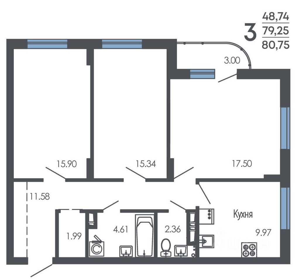 Продаётся 3-комнатная квартира в строящемся доме (Дом 1, дом 2), срок сдачи: I-кв. 2027, общей площадью 80.75 кв.м., на 3 этаже. Новый жилой комплекс от группы компаний "Проект Инвест" расположен по адресу: г. Воронеж, по ул. Шишкова.