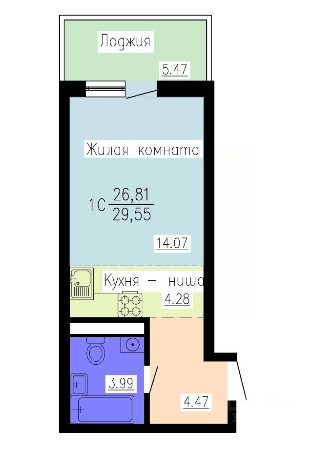 Продается квартира-студия общей площадью 29,55 м², от Застройщика. Большая лоджия, монолитный каркас, стены- кирпич и ГСБ. Возможно выполнение отделки Застройщиком (чистовая и предчистовая). В продаже есть кладовые от 3 до 9 м².
