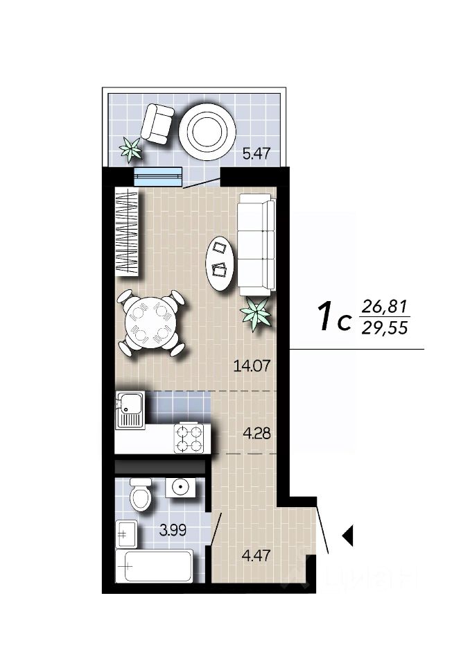 Продается квартира-студия общей площадью 29,55 м², от Застройщика. Большая лоджия, монолитный каркас, стены- кирпич и ГСБ. Возможно выполнение отделки Застройщиком (чистовая и предчистовая). В продаже есть кладовые от 3 до 9 м².