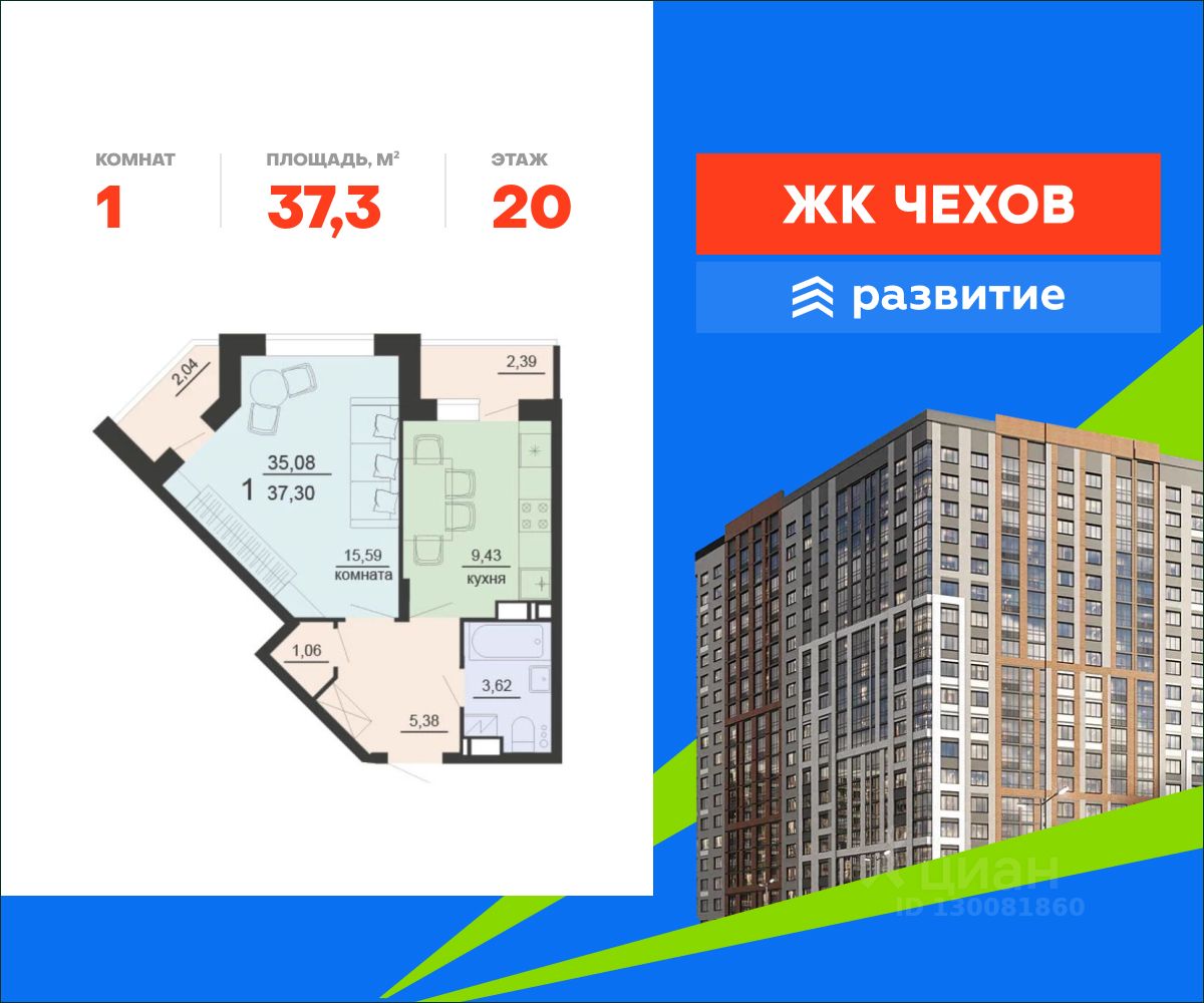 Продается квартира площадью 37.30 кв. м без отделки. Квартира находится на 20 этаже 20 этажного дома, в жилом комплексе "Чехов". Комплекс расположен по адресу - г. Воронеж, ул. Богдана Хмельницкого д. 45а.