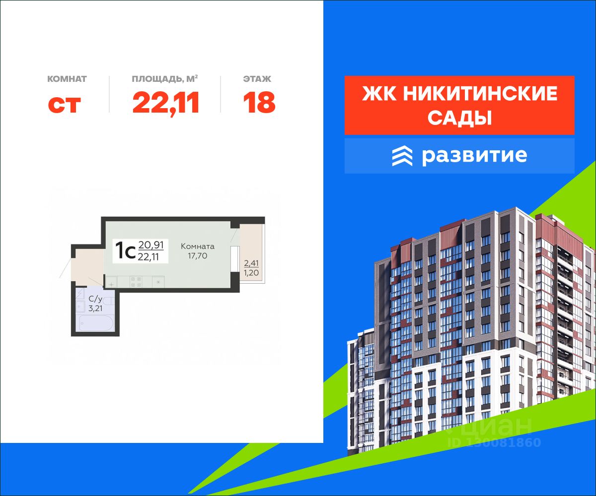 В продаже квартира площадью 22.11 кв. м с черновой отделкой. Квартира расположена на 18 этаже 20 этажного дома, в жилом комплексе комфорт-класса "Никитинские сады".