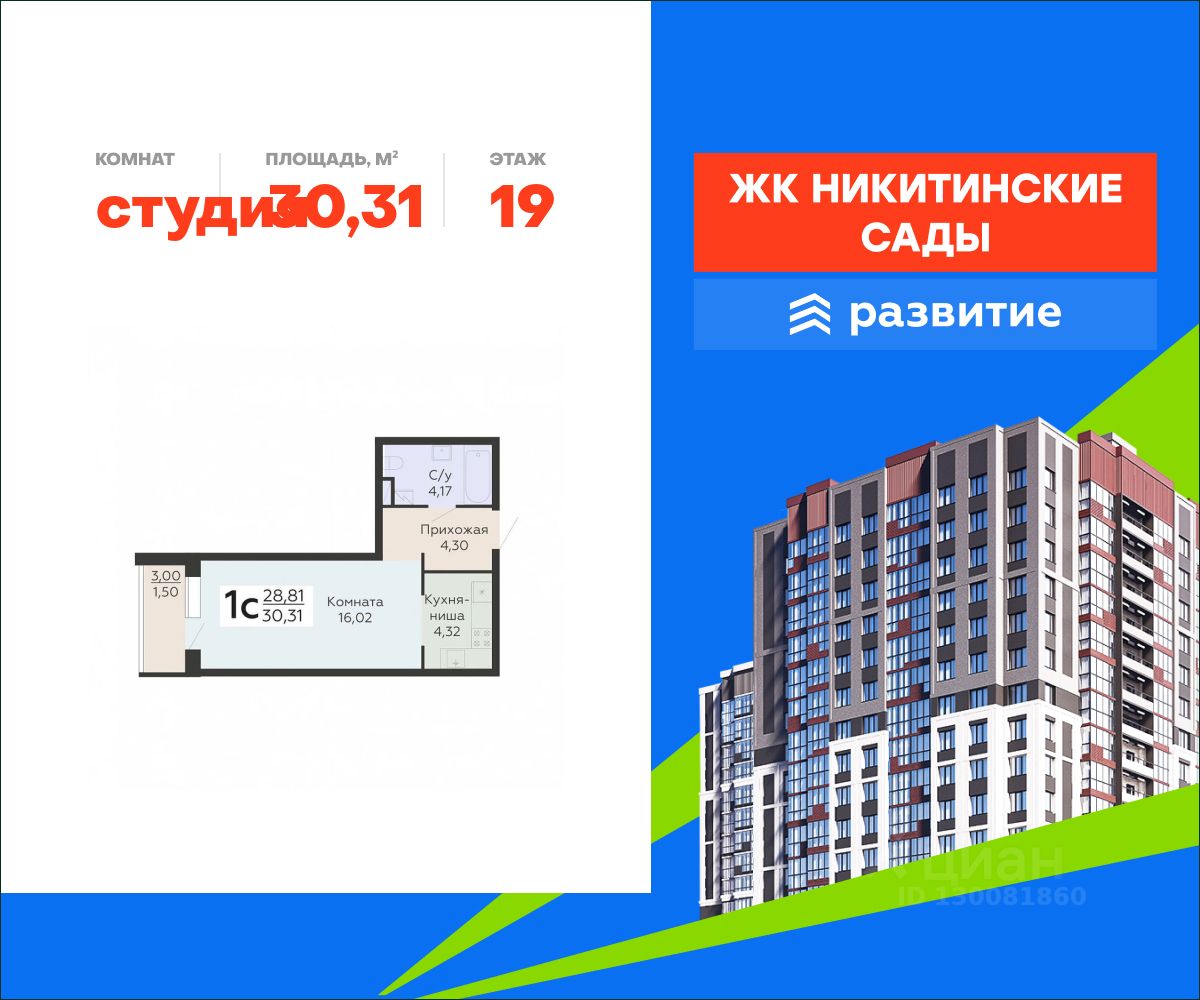 В продаже квартира площадью 30.31 кв. м с отделкой. Квартира расположена на 19 этаже 20 этажного дома, в жилом комплексе комфорт-класса "Никитинские сады".