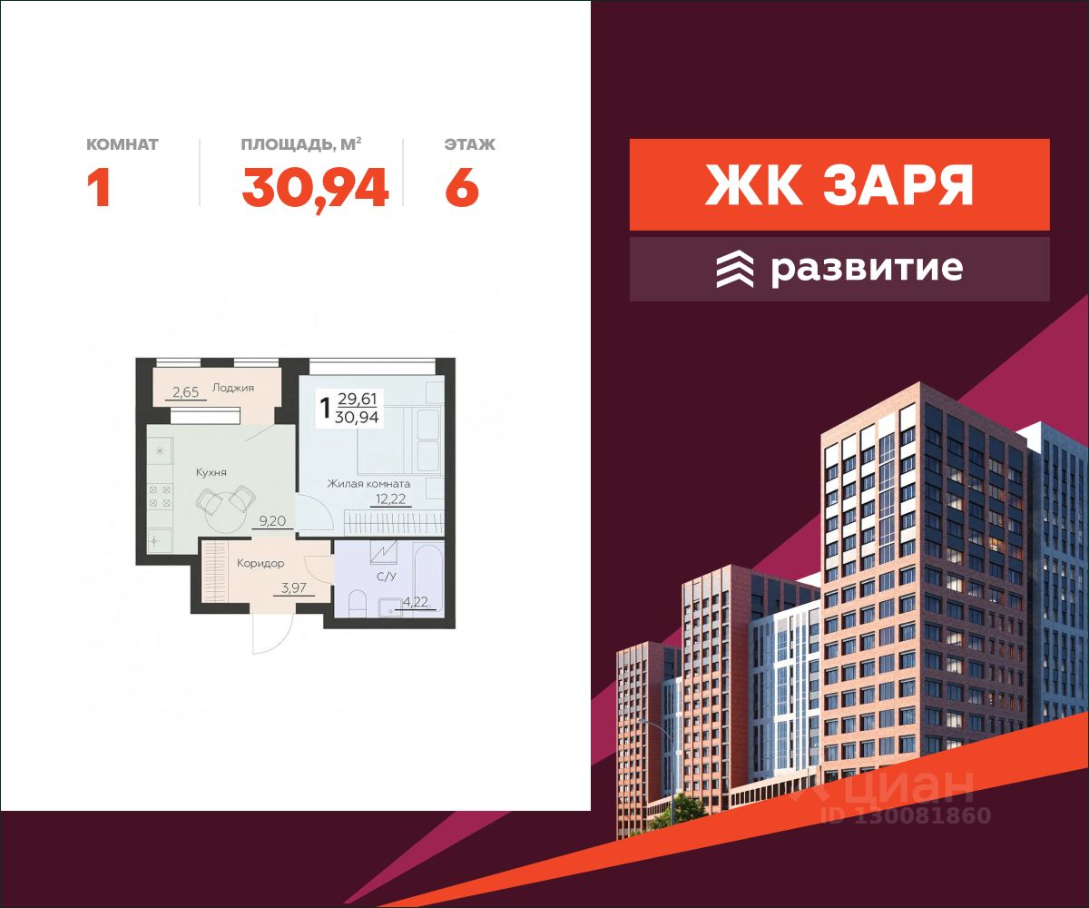 В продаже квартира площадью 30.94 кв. м с черновой отделкой. Квартира расположена на 6 этаже 14 этажного дома, в новом жилом комплексе "Заря" от федерального девелопера "Развитие".