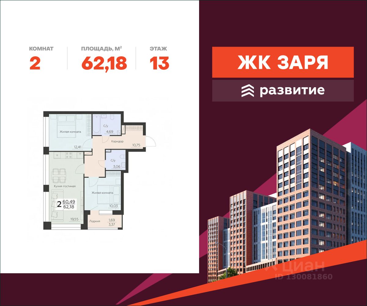 В продаже квартира площадью 62.18 кв. м с черновой отделкой. Квартира расположена на 13 этаже 16 этажного дома, в новом жилом комплексе "Заря" от федерального девелопера "Развитие".