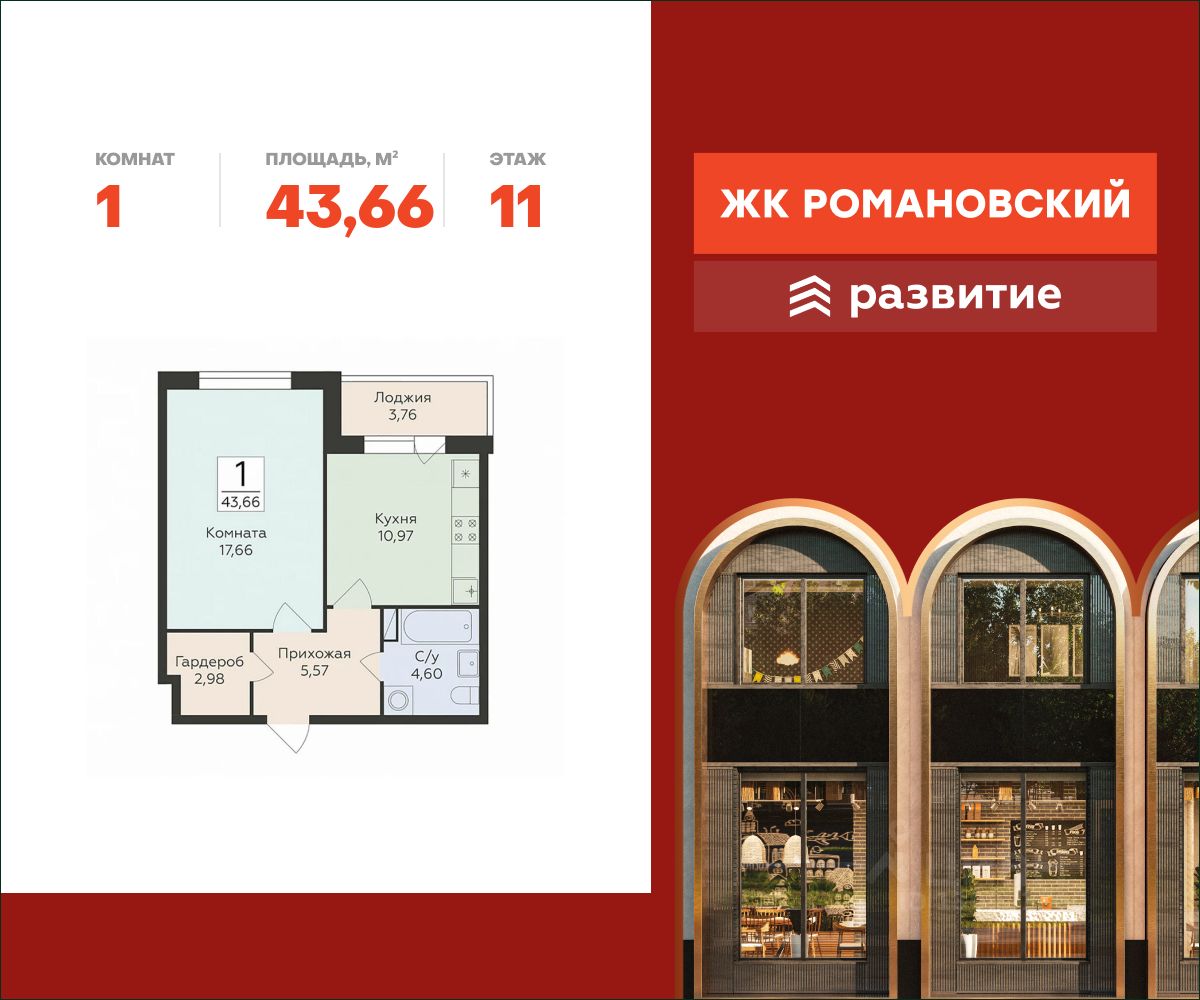 В продаже квартира площадью 43.66 кв. м с черновой отделкой. Квартира расположена на 11 этаже 16 этажного дома, в жилом комплексе "комфорт плюс" класса "Романовский".