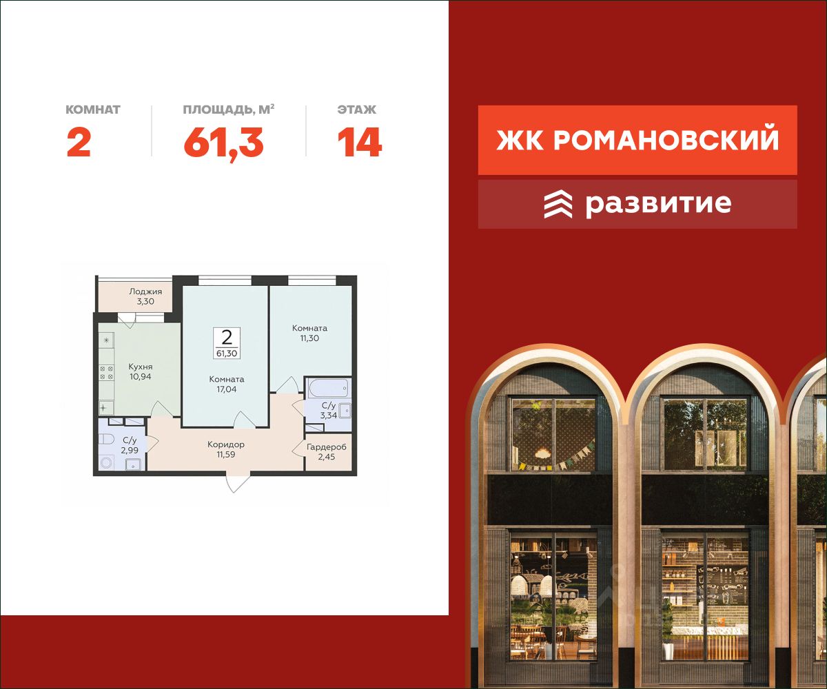 В продаже квартира площадью 61.30 кв. м с черновой отделкой. Квартира расположена на 14 этаже 18 этажного дома, в жилом комплексе "комфорт плюс" класса "Романовский".