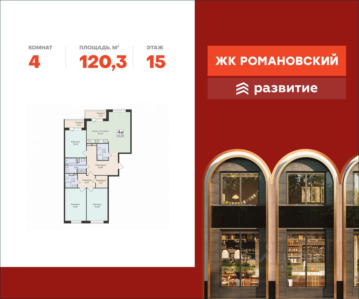 В продаже квартира площадью 120.30 кв. м с черновой отделкой. Квартира расположена на 15 этаже 16 этажного дома, в жилом комплексе "комфорт плюс" класса "Романовский".