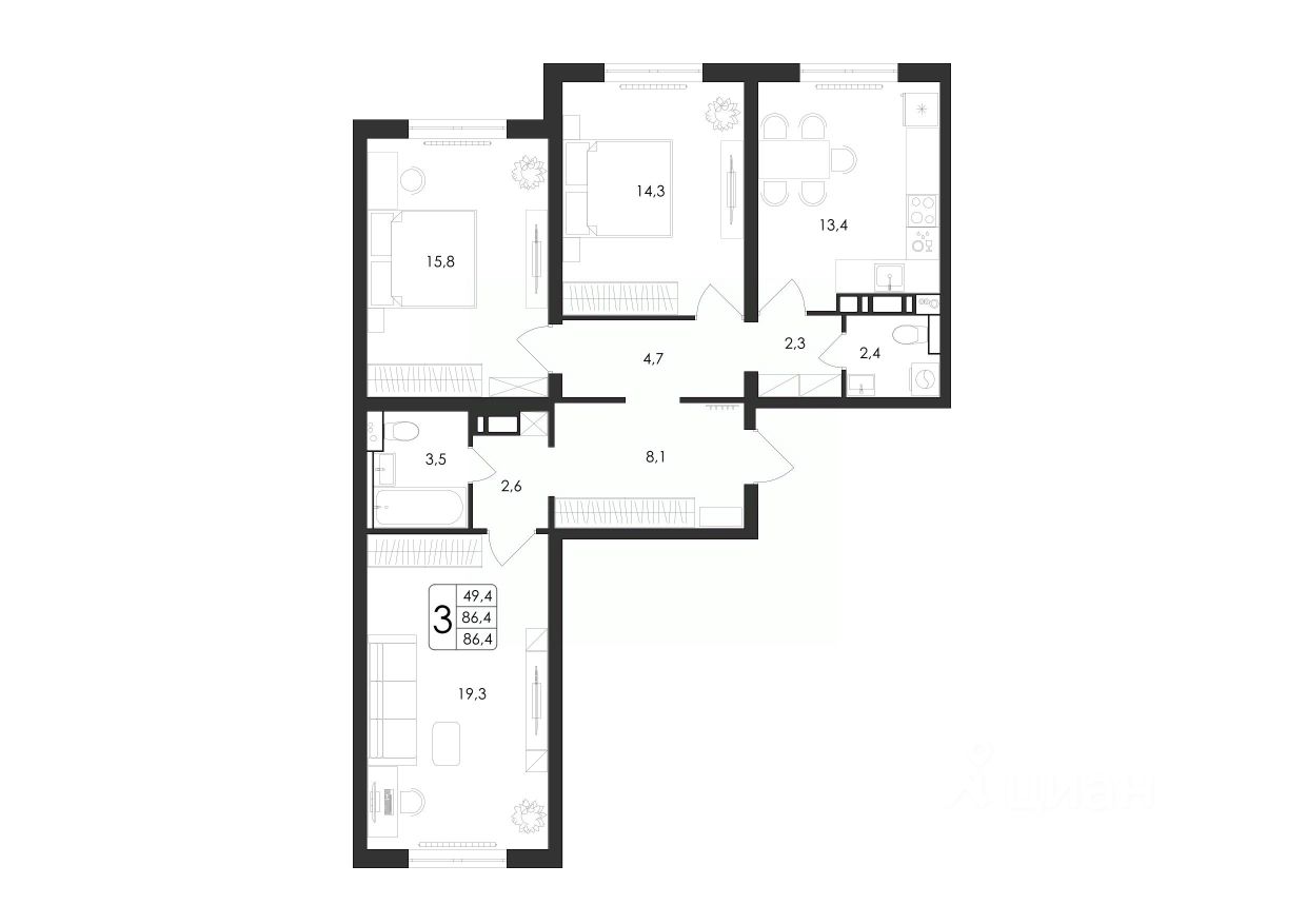 Общая площадь86,4 м²
